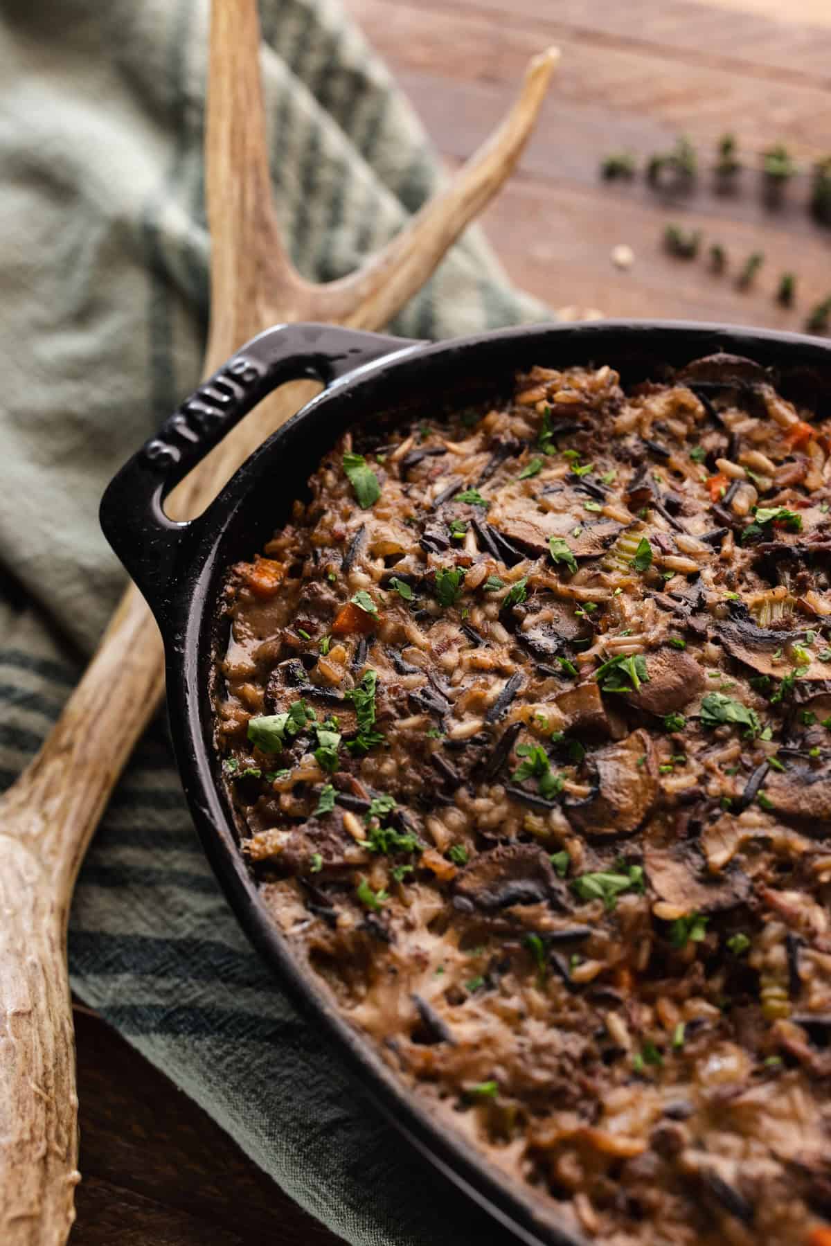 - A wild rice blend adds texture and a slightly nutty flavor that pairs well with venison. Cooking it slightly underdone ensures it finishes perfectly in the oven.